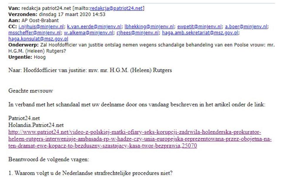 I ten właśnie link wysłaliśmy 17 marca 2020 do holenderskiej Prokuratury Generalnej, Ministerstwa Sprawiedliwości i mediów w Holandii. By upublicznić zakłamanie oraz łamanie prawa przez szefową tamtejszej prokuratury. Bo zamiast urzędowej decyzji, prokurator Heleen Rutgers wysłała pani Beacie niezgodną z procedurami poradę prawną!